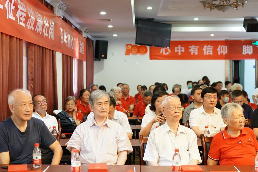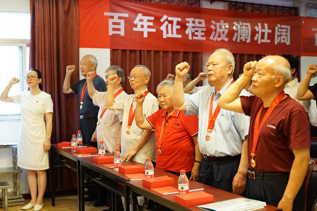 退休党员代表、原自动控制系主任胡亚光作为纪念章获得者代表发言,他深情回顾了自己入党时的初心,以及老一辈华中大人的奋斗精神。他表示,“光荣在党50年”纪念章获得者把一辈子奉献给了党,奉献给了人民,奉献给了学校,希望后来者能将华中大精神发扬光大,为实现学校“双一流”建设目标,为实现中华民族伟大复兴而不懈奋斗。在胡亚光的带领下,全体到会党员重温了入党誓词。