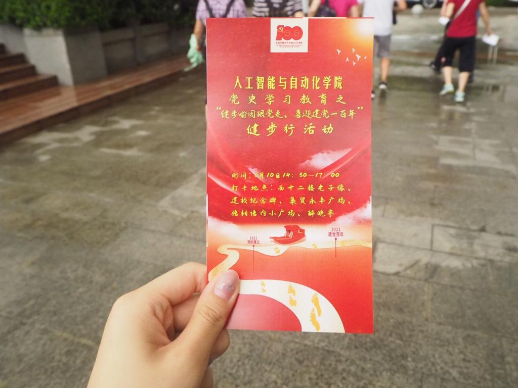 活动以毛主席像作为起点和终点,共在西十二教学楼、建校纪念碑、永丰广场、梧桐雨问学中心和醉晚亭设置了五个党史知识加油站。师生们需在起点领取手卡,前往所有加油站,进行党史知识问答,并分别完成“学党史、悟思想、办实事、开新局”“喜迎建党100周年”的打卡。