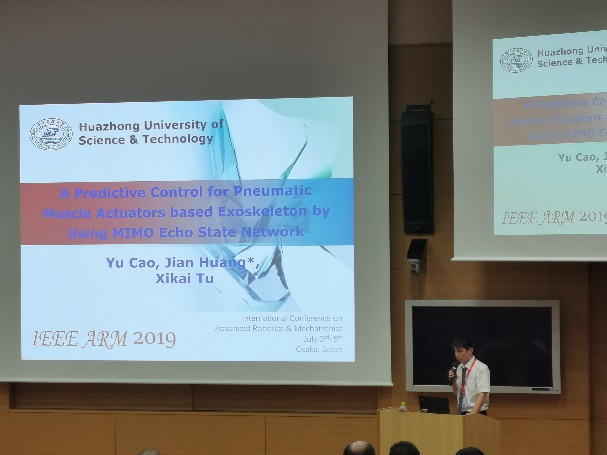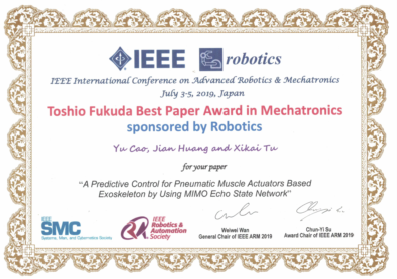 外骨骼机器人就像穿在人体上的“外部骨骼”,可用于修复和增强人体运动能力,是当前机器人领域热点之一。通过传感读取人体的运动状态与意图,外骨骼机器人驱动器带动机构运动实现人肢体的辅助,在医疗、工业、军事等领域的应用中有着广阔的前景。然而,这种人机电一体化系统往往带有强非线性、参数时变性和不确定性,为外骨骼机器人的控制带来了巨大的挑战。针对这个挑战,在黄剑教授的指导下,曹瑜同学在会场做了题为“A Predictive Control for Pneumatic Muscle Actuators Based Exoskeleton by Using MIMO Echo State Network”的学术报告,并获得“Toshio Fukuda Best Paper Award in Mechatronics”。