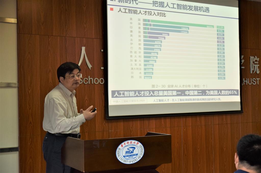 曾志刚首先以“新时代 新学院 新征途”为题,为毕业生代表们带来了一堂毕业思政课。他指出,中美贸易摩擦带来的中美关系变化和新一轮工业革命的来临,是国家、学校、学院和个人都需要面对的挑战;而学院在积极响应国家战略部署的基础上,充分发挥自身优势,已经取得了一定的成绩,并将进一步谋划人工智能领域的教学、科研和产业结合,为国家、学校的人才培养工作作出新的贡献。曾志刚还号召大家努力成为人工智能时代的复合型科技人才。