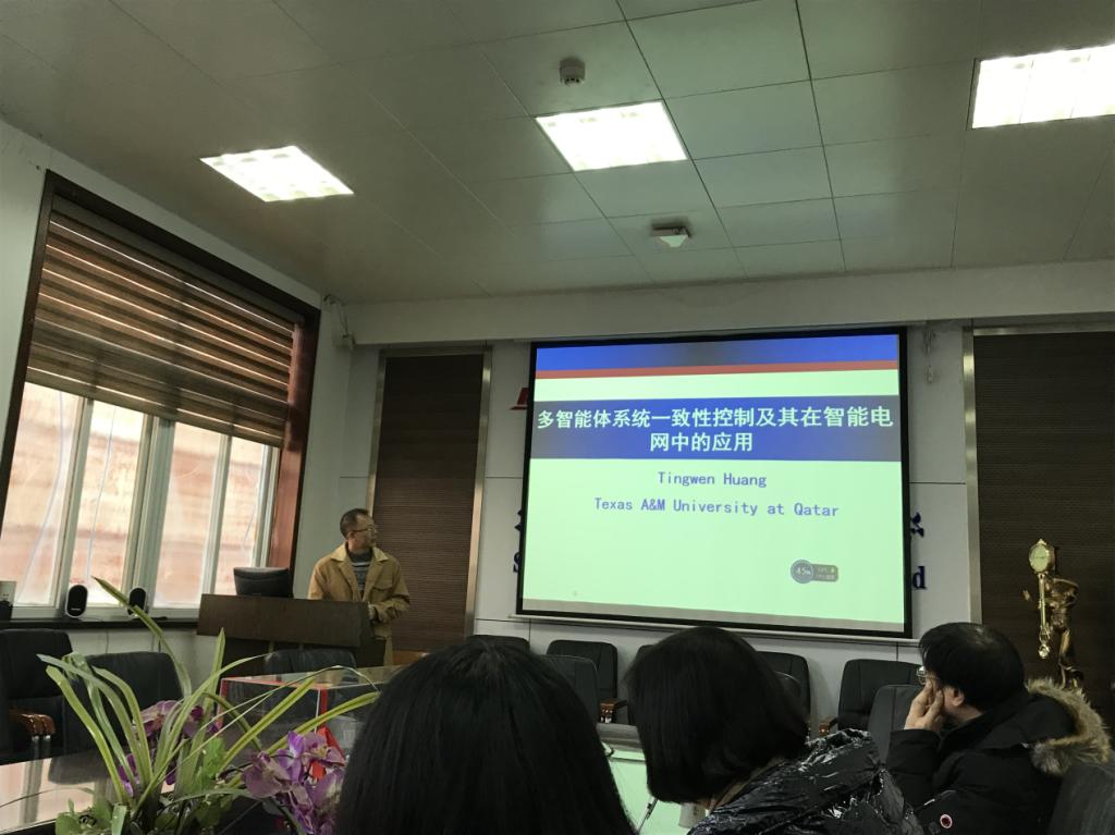 2018年12月18日上午10:00,美国德克萨斯A&M大学卡塔尔分校的黄廷文教授应邀来永利集团官网进行学术访问,在南一楼中302会议室为永利集团官网师生做了一场题为 “Consensus of multi-agent system and applications to smart grid” 的学术报告。曾志刚教授、王小平教授、温世平副教授以及刘慧副教授等30余名师生参加了本次报告会。