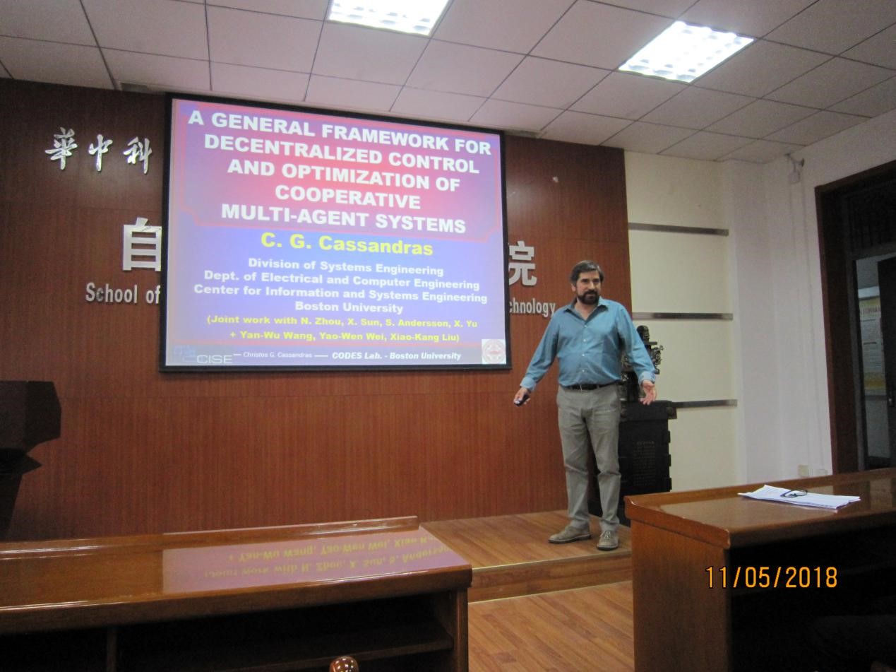 5月11日上午,波士顿大学( Boston University)杰出教授、IEEE和IFAC院士Christos G. Cassandras博士应关治洪教授邀请来永利集团官网进行学术交流,并作了题为“A General Framework for Decentralized Control and Optimization of Cooperative Multi-agent Systems”的学术报告。报告会由关治洪教授主持,我校教师王燕舞、刘智伟、池明、胡滨等30多位师生参加了报告会。