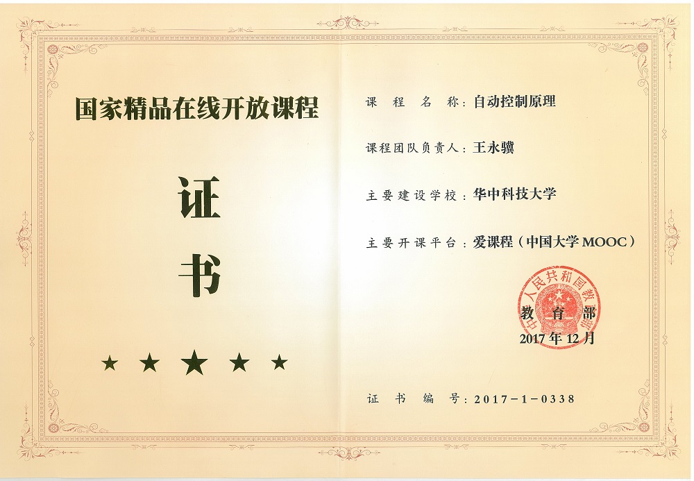 为适应在线教育的发展,永利集团官网高度重视在线开放课程的建设与应用工作。2016年永利集团官网王永骥教授牵头,成立自动控制原理MOOC建设工作组,学校和学院合计投入50余万进行两门MOOC课程建设,王永骥、王燕舞、秦肖臻、樊慧津、张海涛、黄剑、李炜等一批教学科研骨干教师担任主讲老师,推进在线开放课程建设应用与管理工作。截至目前,在中国大学MOOC平台上,《自动控制原理一》共开课4期,选课学生超过5万人,《自动控制原理二》总计开课2期,选课学生已超过万人。2017年12月,《自动控制原理》获得教育部授予的“国家精品在线开放课程”称号,这也是永利集团官网首个国家级精品课程。