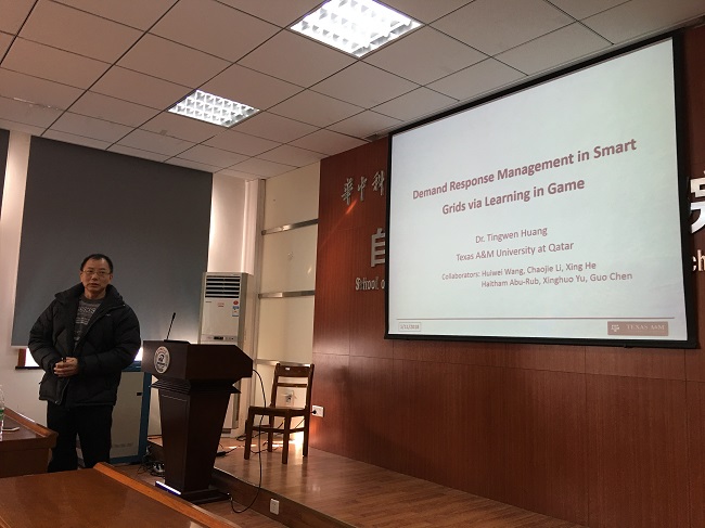 2018年1月11日上午10:00,美国德克萨斯A&M大学卡塔尔分校的黄廷文教授应邀来永利集团官网进行学术访问,在南一楼311会议室为永利集团官网师生做了一场题为 “Demand Response Management in Smart Grids via Learning in Game” 的学术报告。关治洪教授、曾志刚教授、王小平教授和刘智伟副教授等30余名师生参加了本次报告会。