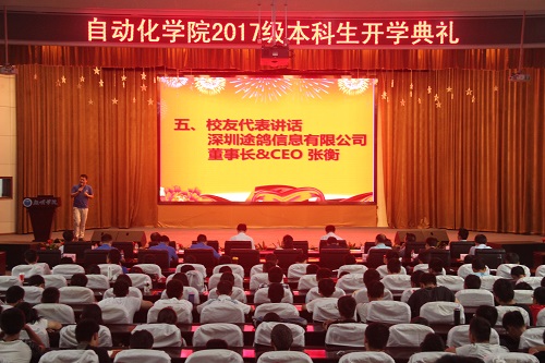 95级校友、深圳途鸽信息有限公司董事长张衡先生回顾了自己的学习和工作经历,结合自己的人生阅历向新生们分享了三点体会。他希望同学们在学习专业知识的同时,通过广泛的阅读及实践锻炼,提高人文修养,树立正确的人生观、价值观;在追求理想的过程中,留意沿途的风景,多交一些好朋友,并主动与朋友分享自己一路的精彩;建立人生格局,在不断挑战自我、突破创新的同时还要关心社会,承担社会责任,培养家国情怀。