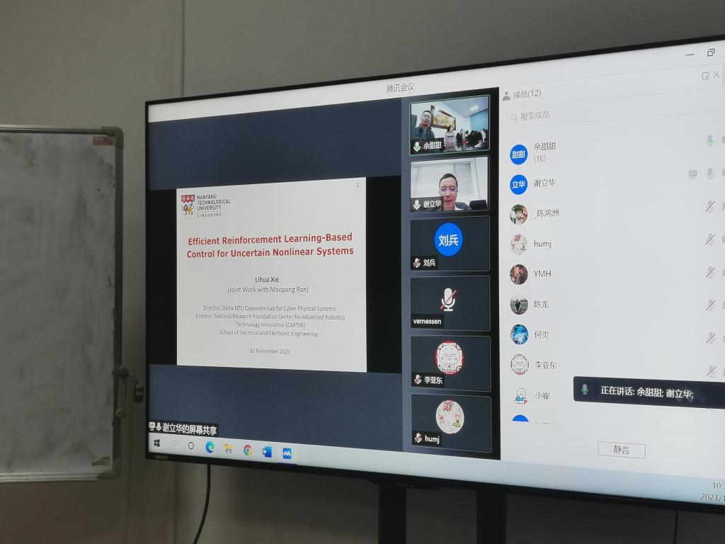 11月30日上午,新加坡工程院院士、南洋理工大学谢立华教授应邀为永利集团官网做学术报告,在304am永利集团南一楼中314,通过腾讯会议平台(会议号641102921)作了题为“Reinforcement Learning-Based Control of Uncertain Nonlinear Systems”的学术报告,报告由刘骁康老师主持,永利集团官网王燕舞教授、樊慧津教授、卢仁智老师等师生约20人以线下方式参加了报告会,线上也有十余人参加了讲座。