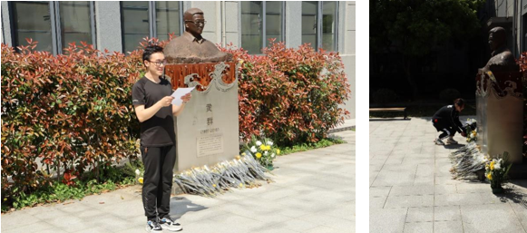 随后,自实1801班组织委员孙哲宇,带领同学们再次回顾学习了黄群校友的事迹和精神;安嘉钰作为代表向黄群雕像敬献花篮。全体同学默哀三分钟,向黄群校友致敬,向黄群精神致敬!