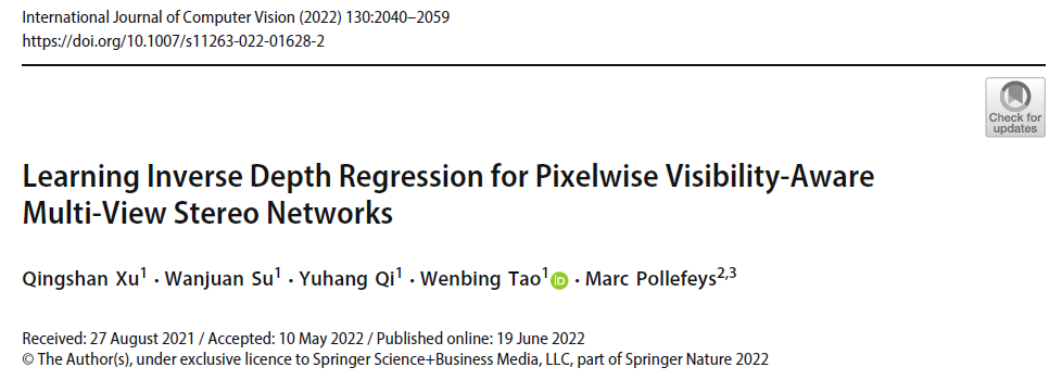 永利集团官网研究生徐青山、孔维航、苏婉娟,齐雨航在导师陶文兵教授的指导下联合苏黎世联邦理工大学(ETH)的Marc Pollefeys教授近期分别在IEEE TPAMI(IEEE Transactions on Pattern Analysis and Machine Intelligence)和IJCV(Internation Jounal of Computer Vision)发表长文,分别研究了基于传统的几何方法的多视图重建以及基于深度学习的多视图重建。304am永利集团为第一作者单位和通讯作者单位。第一作者徐青山已于2021年12月博士毕业,现于新加坡南洋理工大学从事博士后研究。IEEE TPAMI和IJCV均为人工智能领域国际顶级期刊,也是CCF规定的A类期刊,最新发布的影响因子TPAMI为24.314,是目前影响因子最高的CCF A类期刊,IJCV的影响因子为13.369。