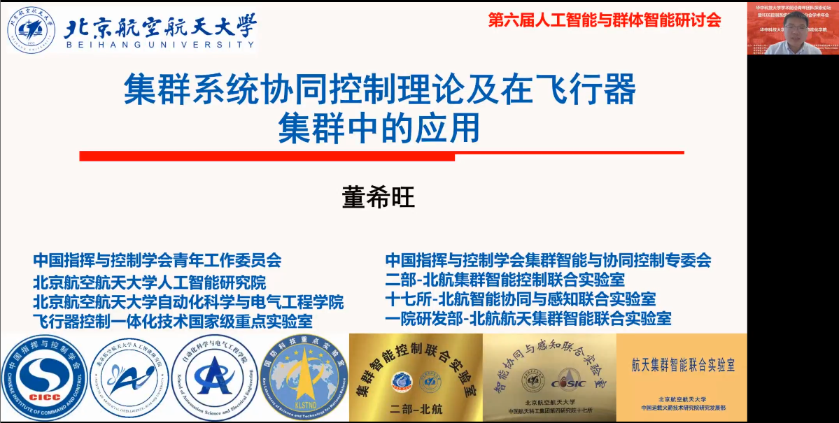 国家高层次人才、北京航空航天大学人工智能研究院副院长董希旺教授做了题为“集群系统协同控制理论及在飞行器集群中的应用”的主题报告,主要针对集群系统协同控制中的分布式时变编队控制技术、编队跟踪控制技术及编队-合围控制技术进行分别介绍,并结合在无人机集群上的系列飞行试验对所提出技术的有效性进行演示验证,最后以所参加的空军“无人争锋”智能无人机集群系统挑战赛密集编队穿越竞速的比赛为例进行应用展示,并对未来的可能发展方向进行概述。