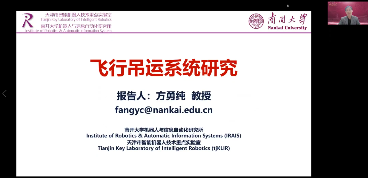 长江特聘、国家杰青、南开大学研究生院常务副院长方勇纯教授做了题为“飞行吊运系统研究”的主题报告,首先介绍了无人机通过吊绳连接负载完成各类任务的研究意义以及研究难点。随后以单机固定绳长单级摆动系统为出发点,根据飞行器数量、绳长可调节性、负载摆动状况的区别,进而介绍多机协作、变绳长和具有二级摆动特性系统的控制方法研究。