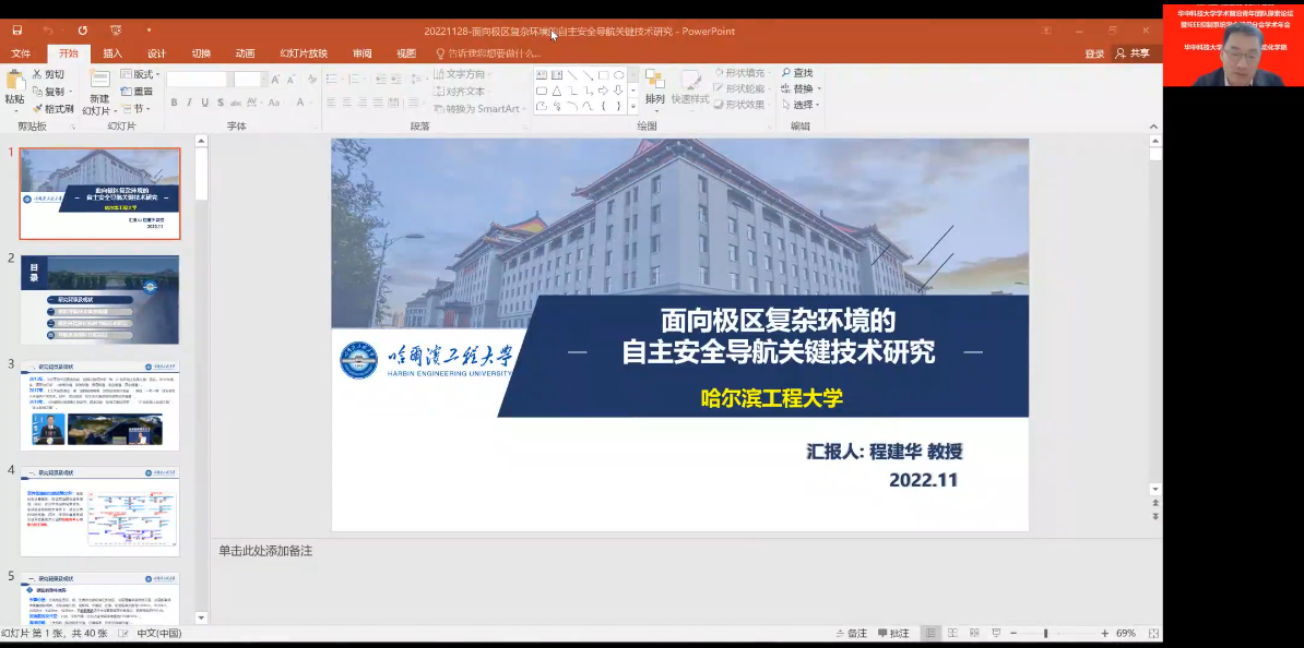 哈尔滨工程大学研究生院常务副院长程建华教授做了题为“面向极区深远海的自主安全导航关键技术研究”的主题报告,首先介绍了极地导航技术的研究背景与现状,并针对极区深远海复杂环境下运载器长航时、高精度和高可靠性的自主导航需求,梳理了适合极区深远海的自主安全导航技术体系。随后介绍了极区高精度长航时导航技术相关研究以及对极地自主安全导航原理性验证与方法的探索,展示了团队所搭建的高拟真、可视化的陆上仿真试验评估系统。最后程教授对极区导航技术的发展进行了展望。