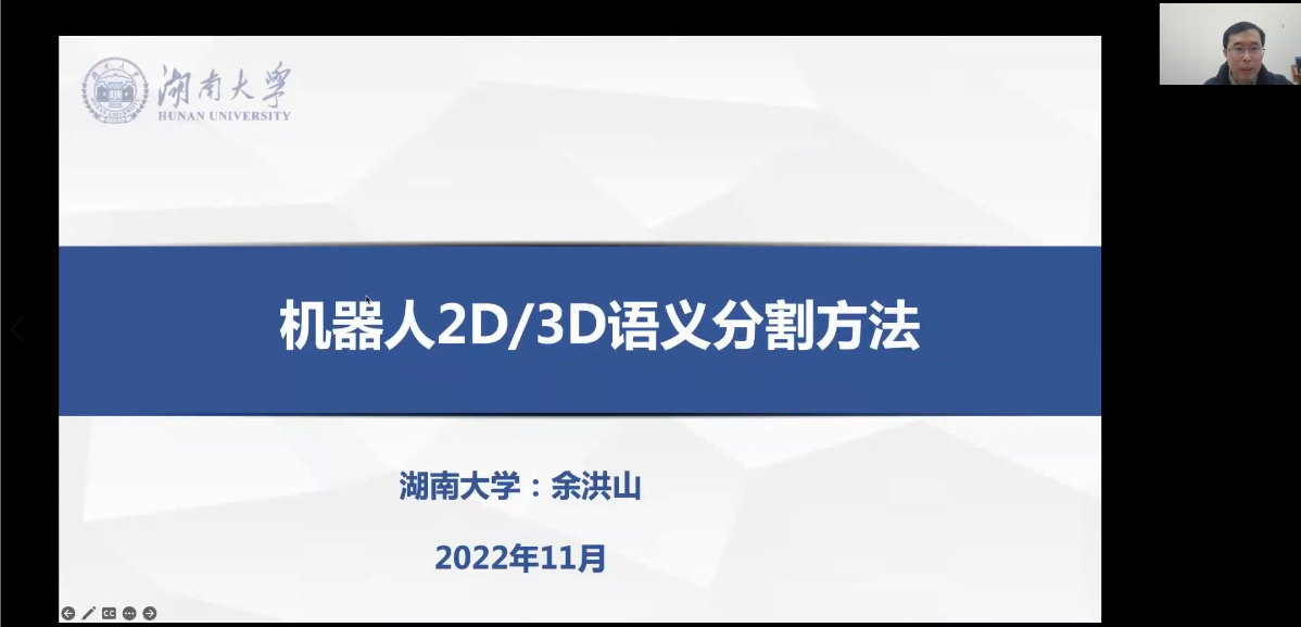 泉州湖南大学工业与机器智能创新研究院副院长、湖南大学余洪山教授做了题为“机器人2D/3D语义分割技术”的主题报告,首先针对机器人/自主无人系统场景理解中语义分割需求,介绍基于深度学习的2D/3D语义分割的发展历史,并针对现有2D语义分割面临的实时性差、样本依赖、泛化能力弱等核心挑战,然后研讨模型与数据驱动的实时语义分割、自监督特征学习、域自适应分割上的研究成果与趋势。最后针对3D语义分割网络鲁棒性差、特征学习能力弱等挑战,研讨在高鲁棒性点云特征学习的卷积模块设计方面的研究成果和发展趋势。