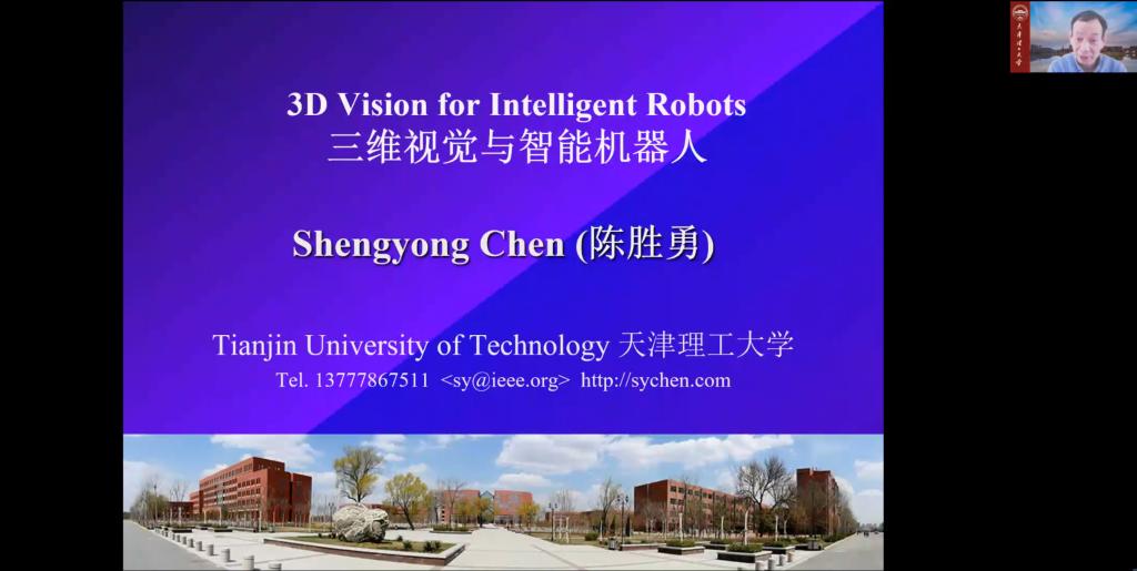 国家杰青、IET Fellow、天津理工大学党委委员、副校长陈胜勇教授做了题为“机器人三维视觉及应用”的主题报告。介绍了三维视觉的基本原理,研究如何让计算机突破传统的二维图像空间,实现三维空间的分析,重构场景的三维几何信息,对场景对象和内容进行理解和交互。随后结合相关应用系统,解决机器视觉系统的可靠性、实时性和主动性,在实时视觉感知、三维成像、视觉定位、跟踪、识别及内容理解等方面给出相关例子。