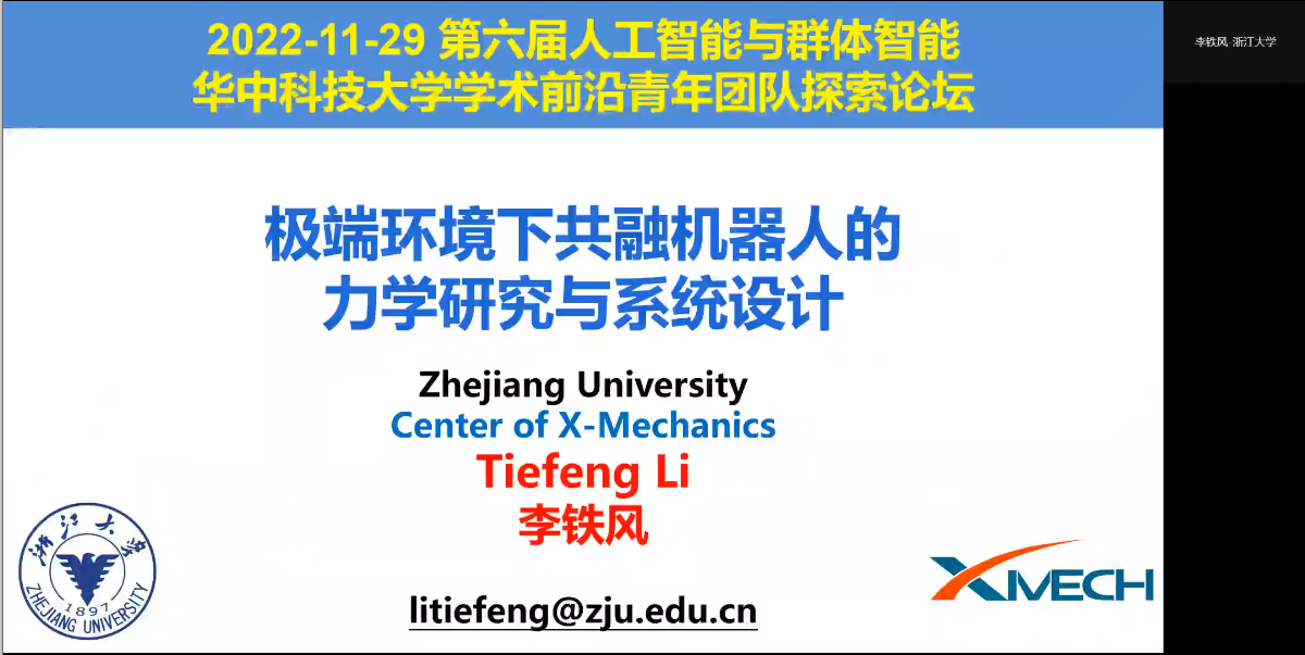 国家杰青、浙江大学李铁风教授做了题为“极端环境下共融机器人的力学研究与系统设计”的主题报告,报告聚焦软物质力学与机器人系统研究,介绍软体机器人设计理论及其系统制造与应用方法,讨论从力学原理出发的材料,结构与系统设计,建立软体智能结构的应力调控理论与水下驱动方法,使一类水下软机器人系统具备快驱动、全透明等功能特性。随后李教授介绍了适应万米深海压力的软体智能机器人系统原理与驱控方法并对研究团队在国际上首次实现软体机器鱼在马里亚纳海沟10900米海底驱动与南海3224米深海航行的相关成果进行了展示。
