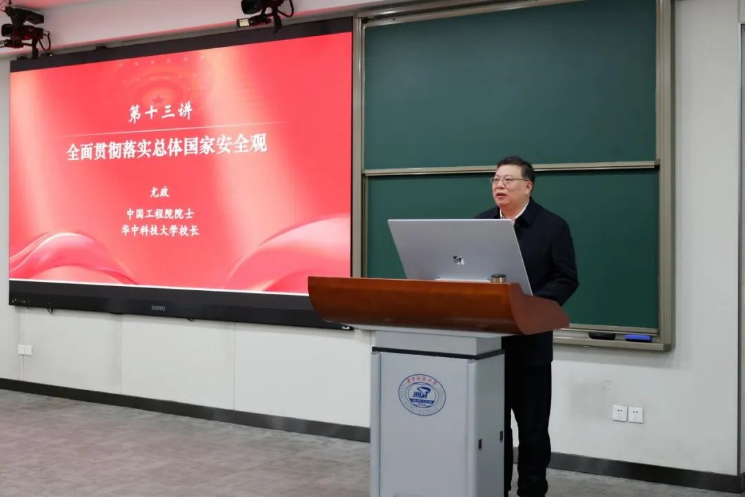 尤政围绕“什么是总体国家安全观”,结合大量事实案例,从形成过程、丰富内涵、坚持中国特色国家安全道路、统筹推进重点领域安全等方面作了详细阐述。他强调,总体国家安全观的关键是“总体”,突出“大安全”理念,需要做到外部安全和内部安全、国土安全和国民安全、传统安全和非传统安全、自身安全和共同安全、维护国家安全和塑造国家安全“五个统筹”。中国特色国家安全道路,本质上是中国特色社会主义道路在国家安全领域的具体体现,要坚持党的绝对领导、坚持捍卫主权和领土完整、坚持安全发展、坚持总体战、坚持走和平发展道路。全面贯彻落实总体国家安全观,要聚焦重点,抓纲带目,把确保政治安全作为首要任务,统筹推进政治安全、国土安全、经济安全、科技安全、社会安全、网络安全、资源安全、外部安全等重点领域国家安全工作。