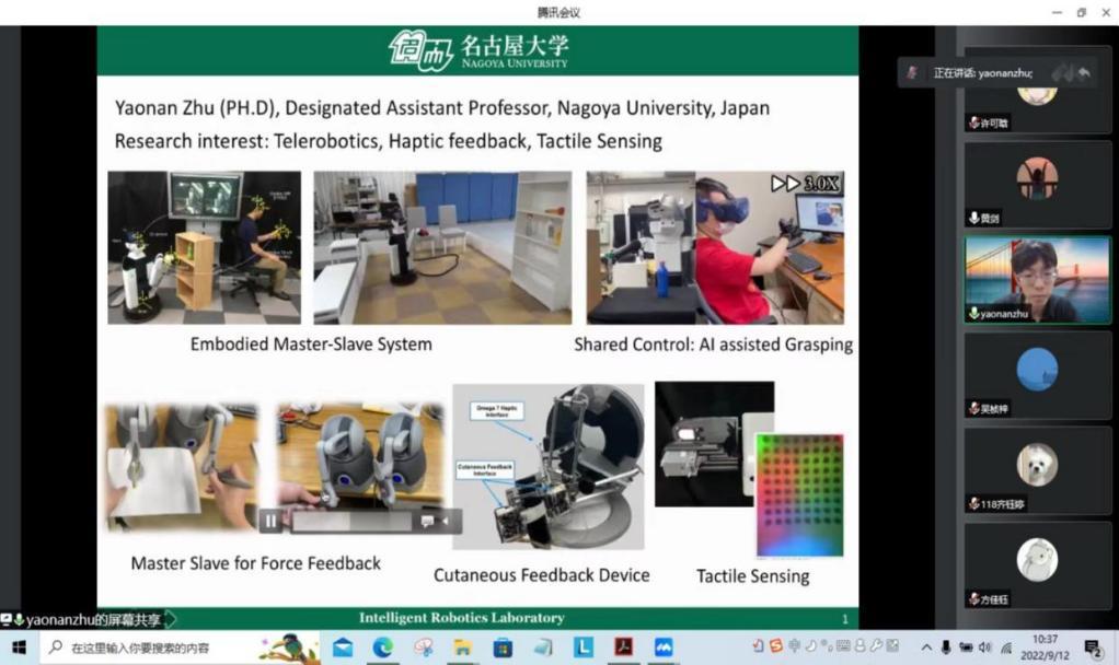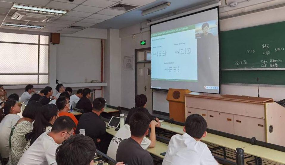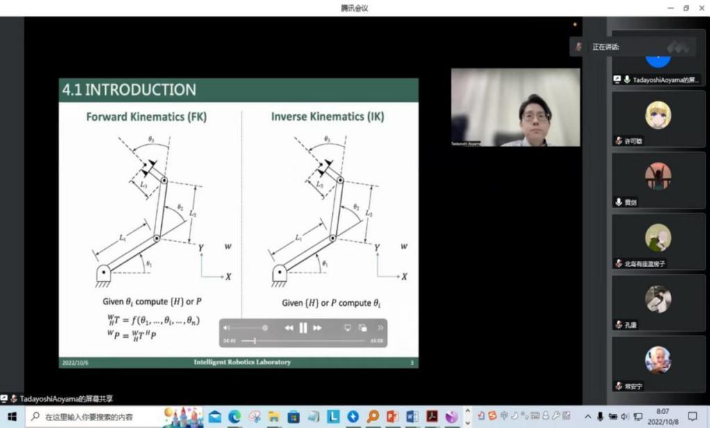 黄剑教授全程参与合作授课,讲授包括操作臂运动学、逆运动学、速度和静力等多方面内容,并对名古屋教师团队教授讲述内容进行解读与补充。