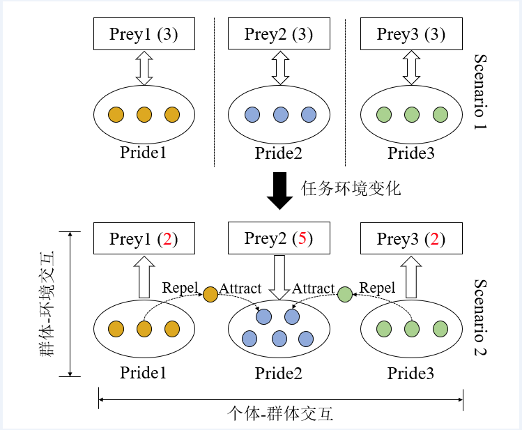 以无人机群协同打击任务为代表的任务分配问题通常处于动态突发情景,而模仿生物群体分工行为的分布式求解模型对此类问题展现出色的动态适应性。邬博文在肖人彬老师的指导下,深入分析狮子群体合作行为、揭示其角色分工特性。针对突发情况下无人机群任务分配问题,构建了狮群角色分工行为与任务分配算法组件的显式映射关系,提出一种狮群角色分工的实现模型用于求解动态任务分配问题。最终该篇题为“狮群合作狩猎启发的无人机集群任务分配”的论文,得到了一致认可,高居大会人气榜首。