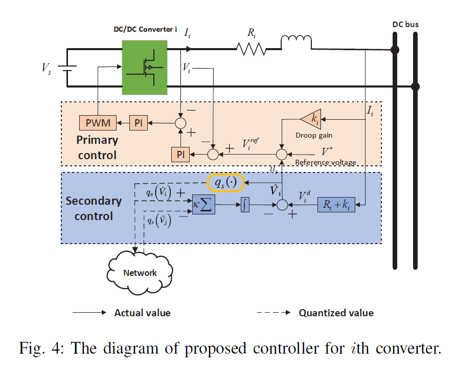 为了消除下垂控制引起的直流微电网电压偏差,分布式二次控制已经得到了广泛的发展。蔡炯在王燕舞老师和刘骁康老师的指导下,考虑了数字通信网络的通信能力限制,特别是信号在传输到信道之前被量化问题。基于此,设计了一种基于量化信号的分布式二次控制策略,以在有限的通信宽度下实现均流和电压恢复,并且通过使用更少的比特数来大大减少通信负担。并通过将信号量化与事件触发机制集成在一起,进一步减少控制器更新,最后通过仿真结果表明了该方法的有效性。