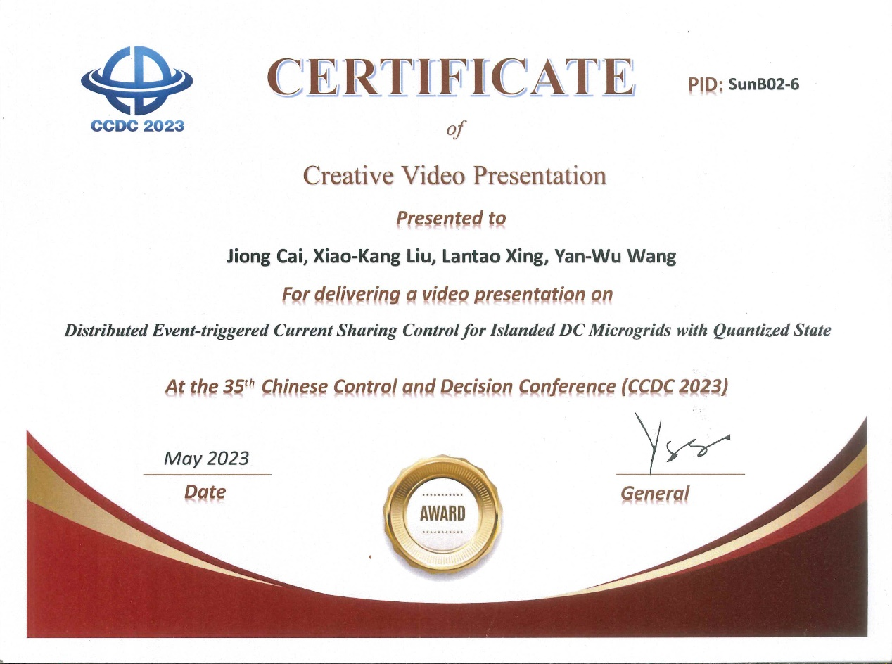 中国控制与决策会议(CCDC)是自动化领域的学术盛会。本届会议在录用的1000余篇学术论文中,鼓励作者制作与论文内容相关的视频作品参评“最具人气作品奖”。会议组委会从提交的视频作品中遴选出18份作品作为候选作品,经过网络投票,再由多位专家终审,最终确定5份作品获得“最具人气作品奖”。