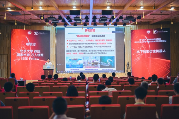 北京大学喻俊志教授做了题为“水下智能仿生机器人”的报告,以仿生机器鱼和机器海豚为例,对水下环境感知、二维机动控制、三维机动控制、跃水运动控制、鱼群诱导、水下仿生应用进行详细介绍,并对未来研究方向和工作重点进行分析和展望。
