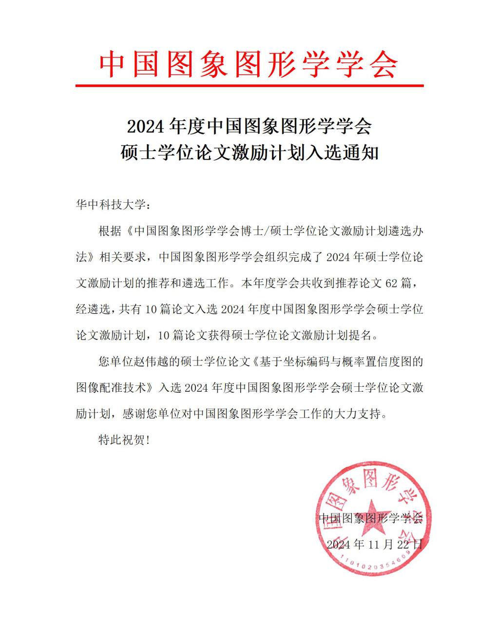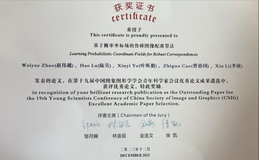 近日,2024年度“中国图象图形学学会硕士学位论文激励计划”(又被称为中国图象图形学学会优秀硕士学位论文)评选结果揭晓。永利集团官网曹治国教授指导的2023届硕士毕业生赵伟越的硕士学位论文《基于坐标编码与概率置信度图的图像配准技术》从62篇推荐论文中脱颖而出,成功入选。