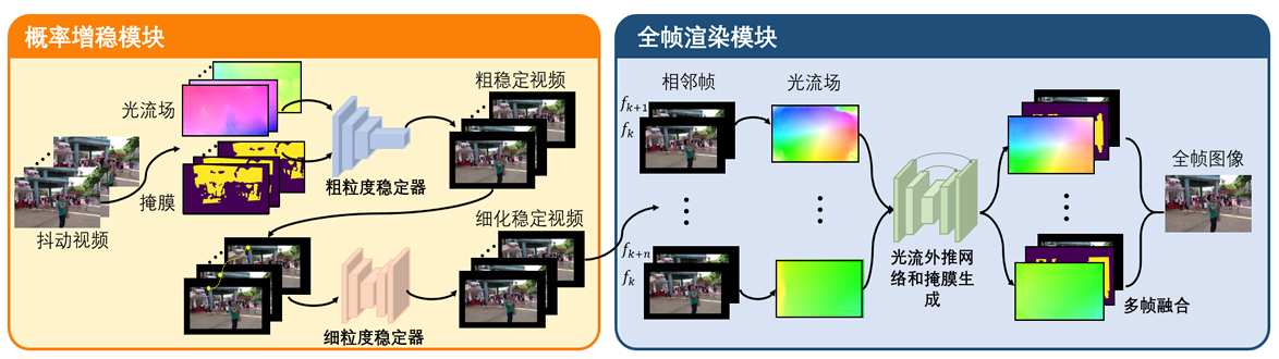 基于概率置信度图与全帧渲染的视频稳像算法流程图