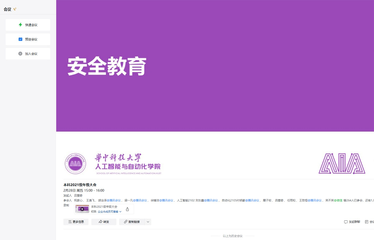 2月28日下午,针对毕业班实习分散、离校事务繁杂的特点,2021级创新采用线上会议形式开展安全教育。辅导员吕董奇通过腾讯会议平台,面向全体安全员及学生骨干,重点围绕实习安全规范、求职防诈指南、离校前宿舍安全管理等内容展开培训,结合近期高校真实案例,剖析简历信息泄露、虚假招聘陷阱等风险。会议设置在线答疑环节,针对毕业生关注的“三方协议安全签署”“实验室设备交接”等问题进行互动解答,并建立“毕业班安全联络群”,确保安全管理“不断线”。