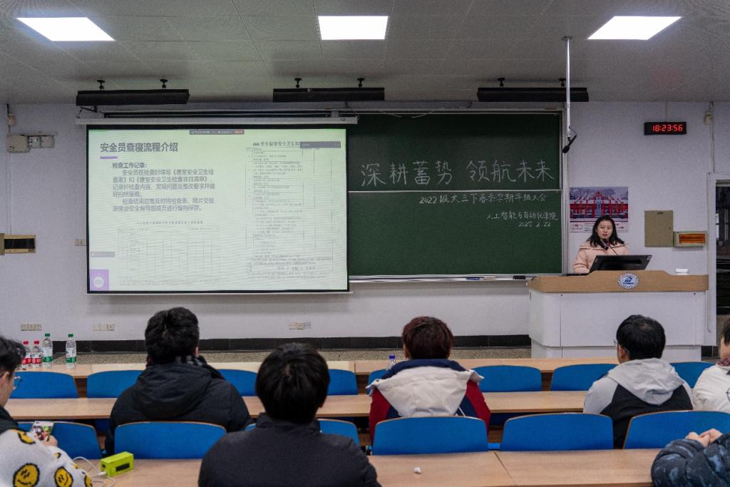 2月22日下午,2022级以“网格化”管理为切入点,在东十二教学楼F101、F102教室召开新学期首次网格安全员会议。辅导员李丹琦宣讲解读《学院网格安全员管理制度》,明确安全员在安全宣传、隐患排查、应急响应中的“三员一体”角色定位。针对高年级特点,会议部署实验室安全巡查、防电信网络诈骗宣传等专项任务,并推出“安全知识竞赛”“优秀网格员评选”等激励机制。李丹琦提出,安全员需依托学院安全工作联席会平台,定期交流经验、共享信息,推动形成“年级联动、全员参与”的安全生态。