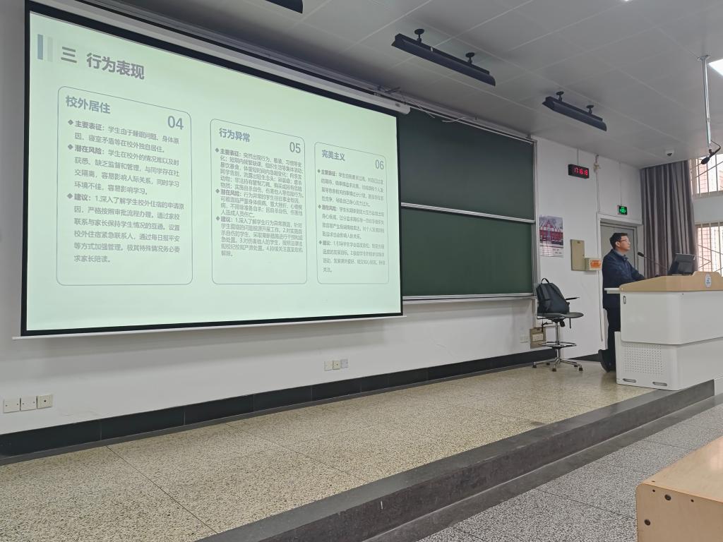 曹攀辉在会中强调:“安全员要牢固树立‘生命至上、安全第一’的理念,以高度责任感和使命感投入工作,为营造安全、稳定、和谐的校园环境贡献力量。”他还提醒大家,学业竞争固然重要,但合理调节压力、保持身心健康同样不可忽视。通过适度运动和有效沟通等方式释放压力,遇到心理困扰时应及时寻求学校心理咨询中心等专业机构的帮助。